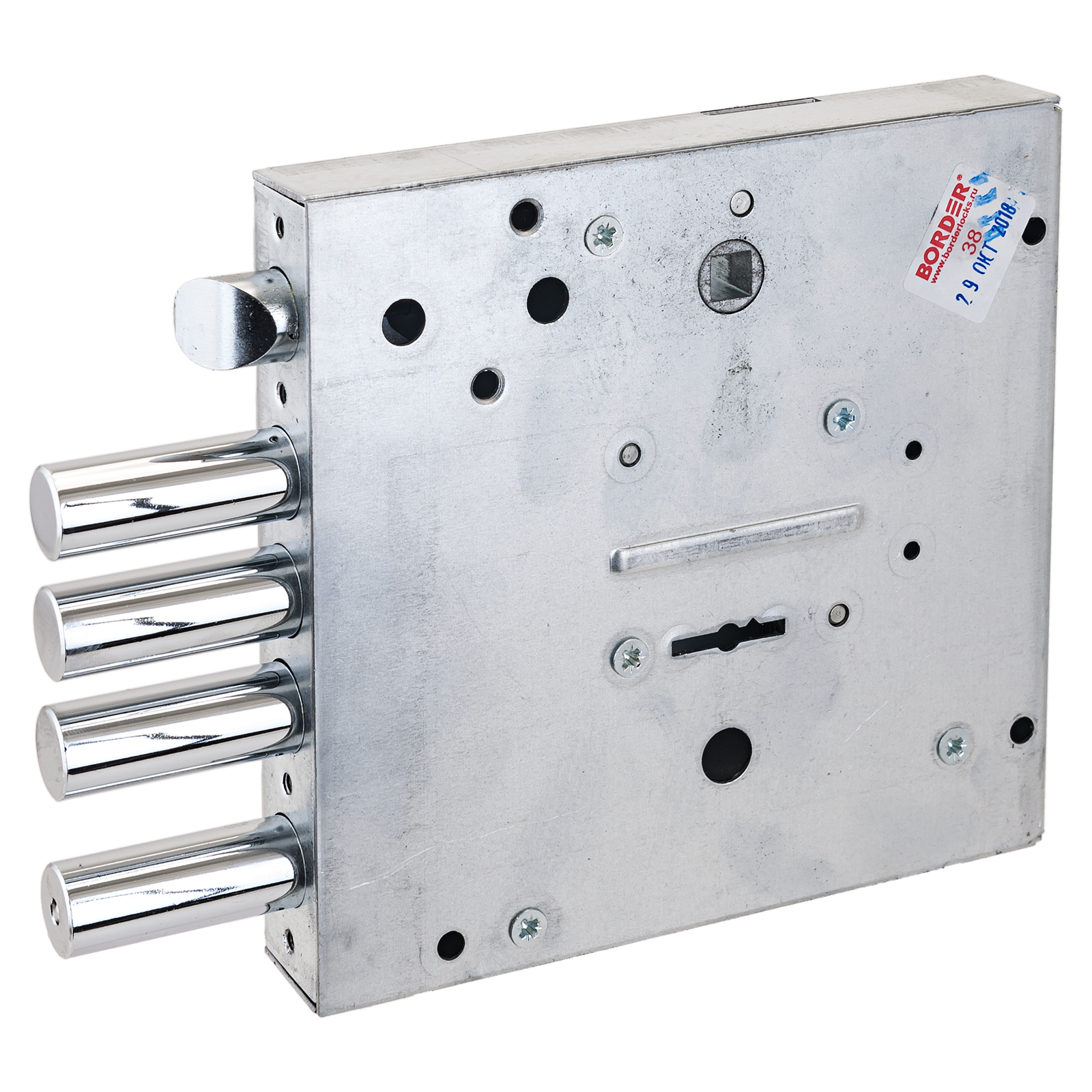 Замок врезной сувальдный с защелкой. Предназначен для металлических дверей. Замок имеет засов из четырех цилиндрических ригелей диаметром 15,7 мм, с максимальным вылетом 39,5 мм, и универсальную защелку диаметром 15,7 мм. Удаление ключевого отверстия 80 мм. Межосевое расстояние 66,2мм. Габариты замка — 150х144х28мм. Комплектация — 5 ключей. В одном из ригелей расположен закаленный стальной стержень, обеспечивающий надежную защиту от перепиливания.