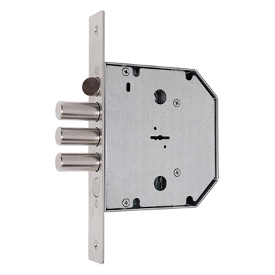Замок врезной сувальдный с защелкой и задвижкой для металлических дверей. Замок имеет засов из трех цилиндрических ригелей диаметром 18 мм, с максимальным вылетом 40 мм, задвижку диаметром 18 мм, вылет 26,4 мм, и защелку диаметром 20мм. Удаление ключевого отверстия 64 мм. Межосевое расстояние — 42 мм до защелки и 47 мм до задвижки. Количество полуоборотов ключа — 4. Габариты замка — 135х146х30мм. Комплектация — 5 ключей. Замок имеет защиту от вскрытия замка отмычкой, защиту от высверливания стойки ригеля и защиту от вскрытия методом проворота.