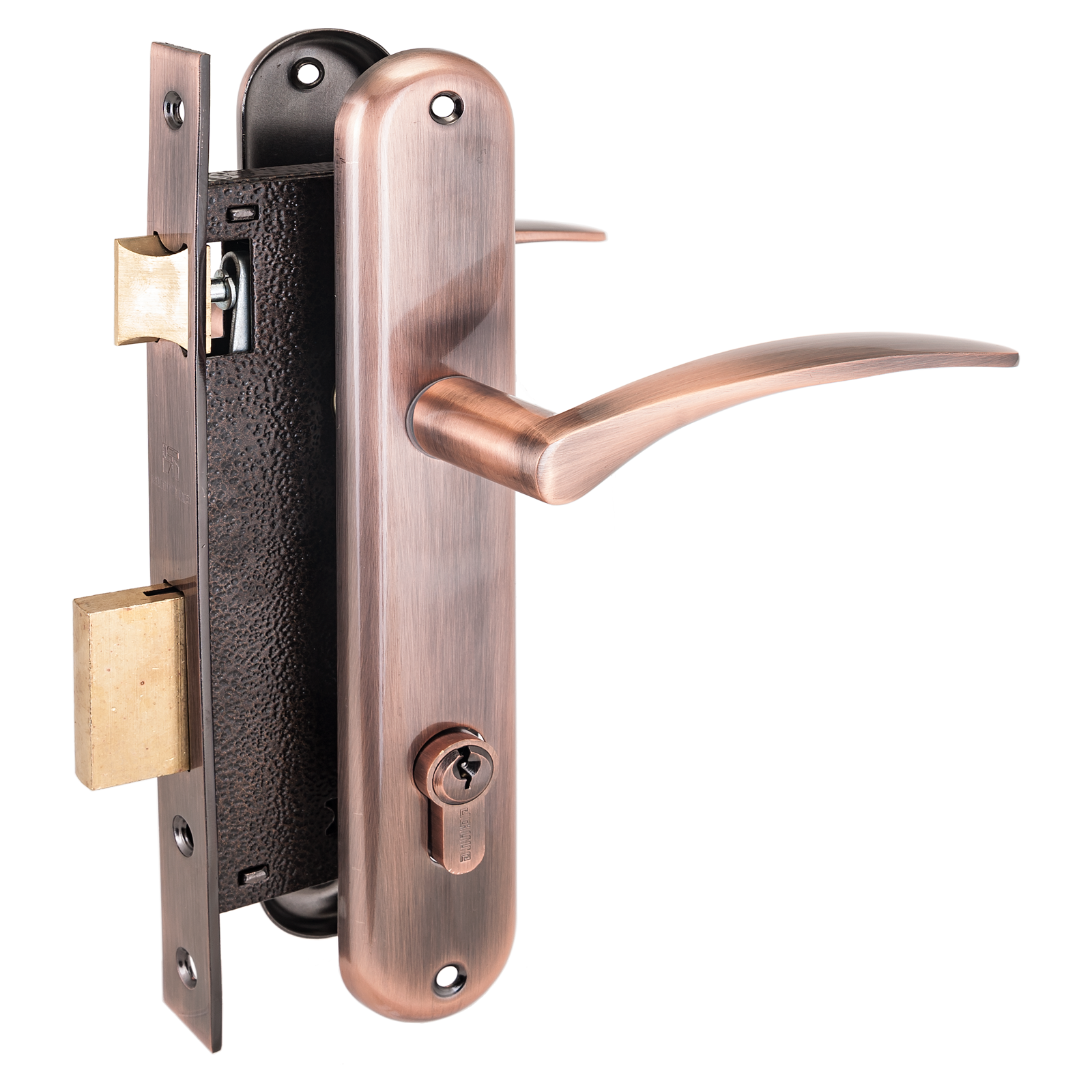 Замок врезной с ручками. Предназначен для установки в деревянные двери толщиной до 40 мм, правого и левого открывания. Дверь может быть закрыта на защелку и открыта с помощью фалевой ручки при открытом засове замка.