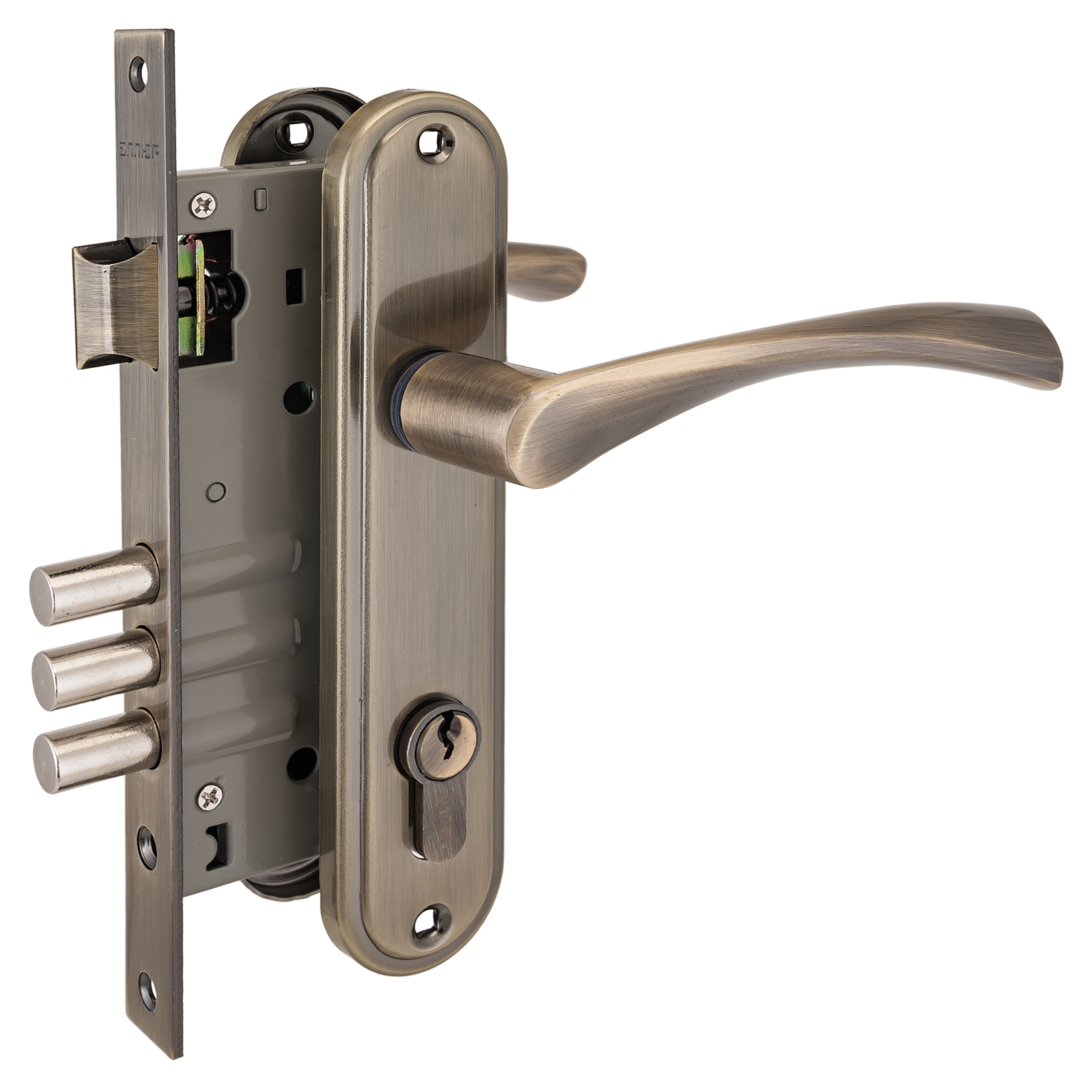 Замок врезной с ручками. Предназначен для установки в деревянные двери толщиной до 40 мм, правого и левого открывания. Дверь может быть закрыта на защелку и открыта с помощью фалевой ручки при открытом засове замка.