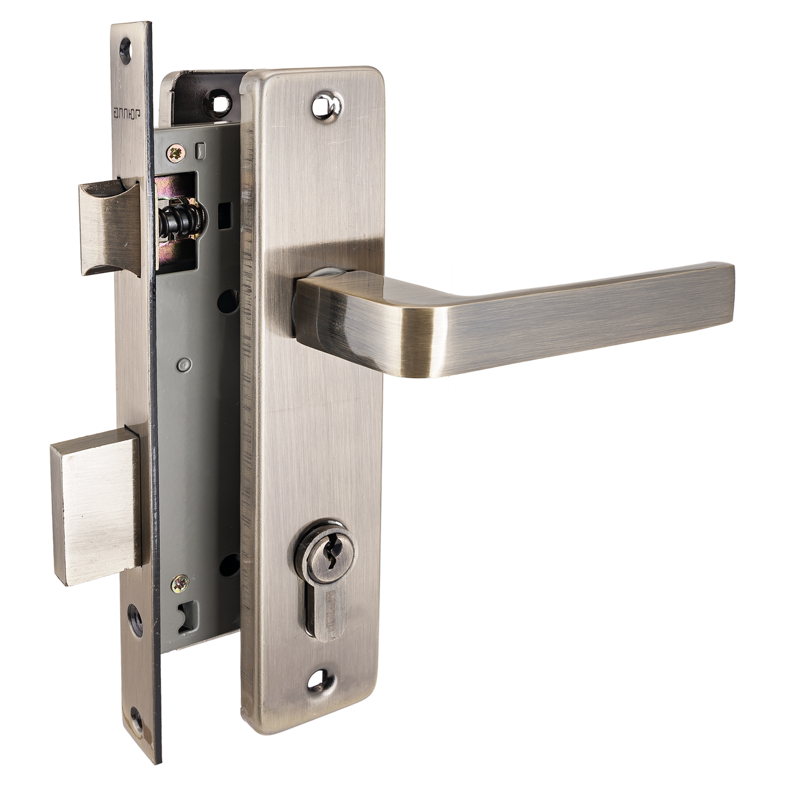 Замок врезной с ручками. Предназначен для установки в деревянные двери толщиной до 40 мм, правого и левого открывания. Дверь может быть закрыта на защелку и открыта с помощью фалевой ручки при открытом засове замка.