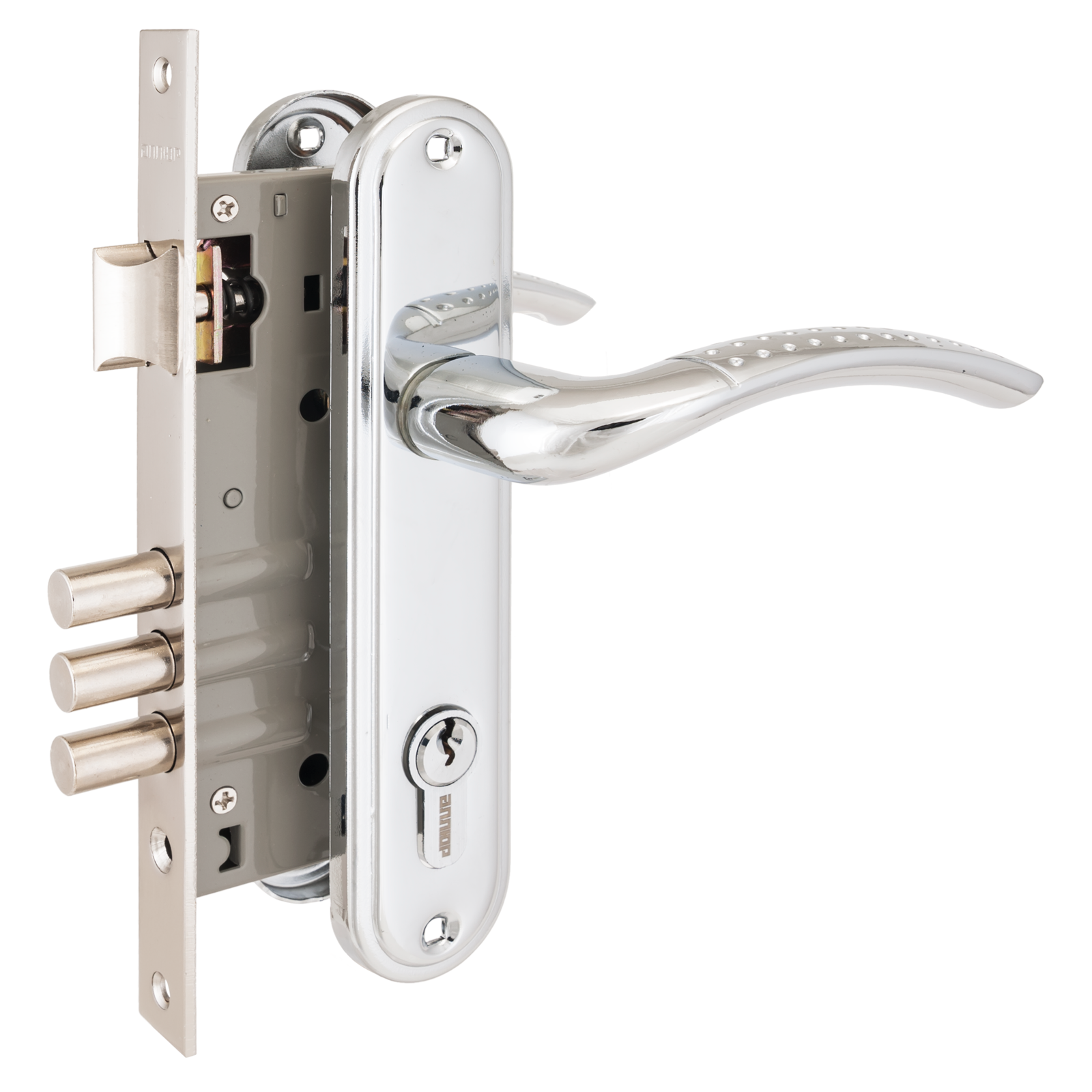 Замок врезной с ручками. Предназначен для установки в деревянные двери толщиной до 40 мм, правого и левого открывания. Дверь может быть закрыта на защелку и открыта с помощью фалевой ручки при открытом засове замка.