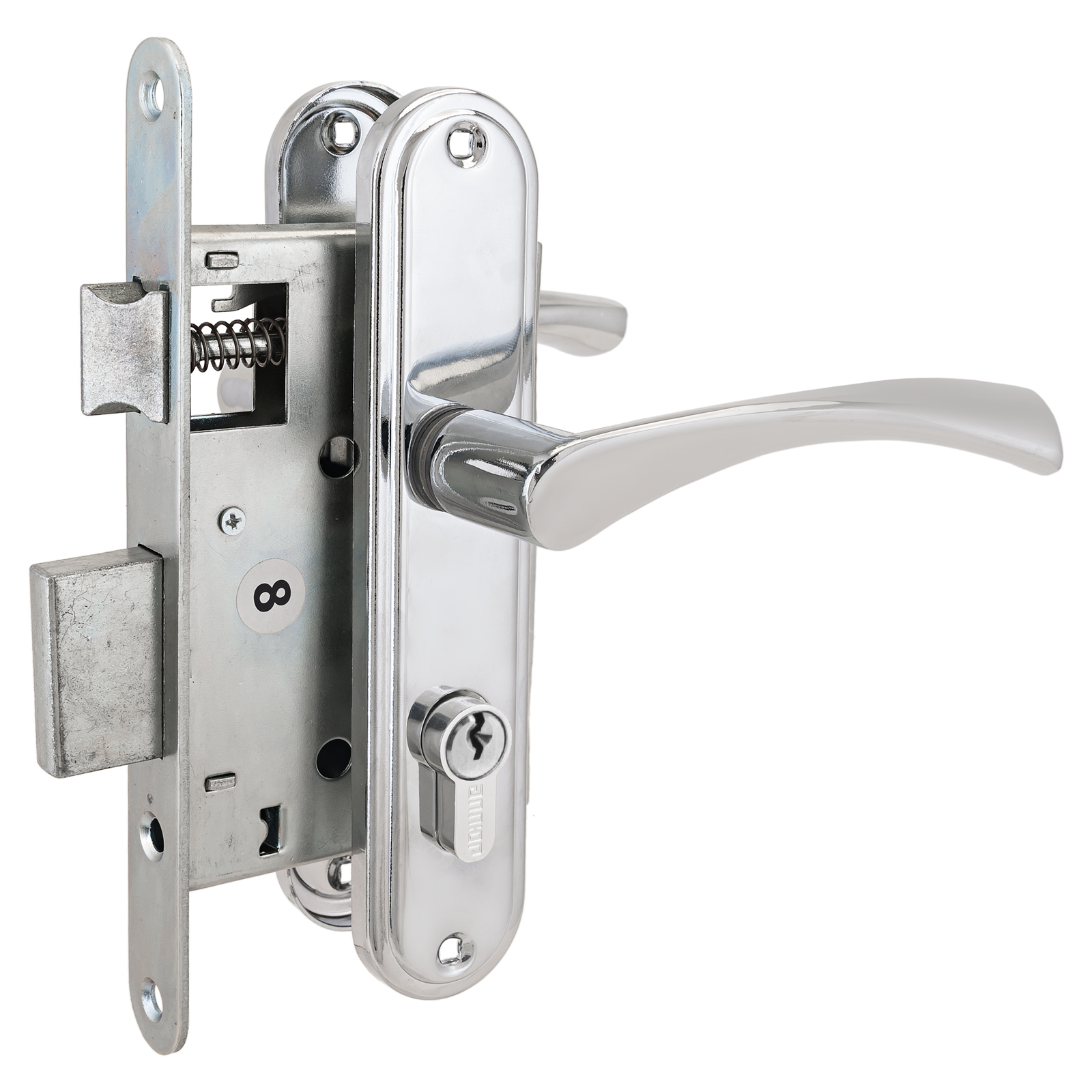 Универсальная защелка. Стальной оцинкованный корпус. Межосевое расстояние 55 мм. Удаление ключевого отверстия 55 мм. Материал ручек — алюминиевый сплав, планки – сталь.
