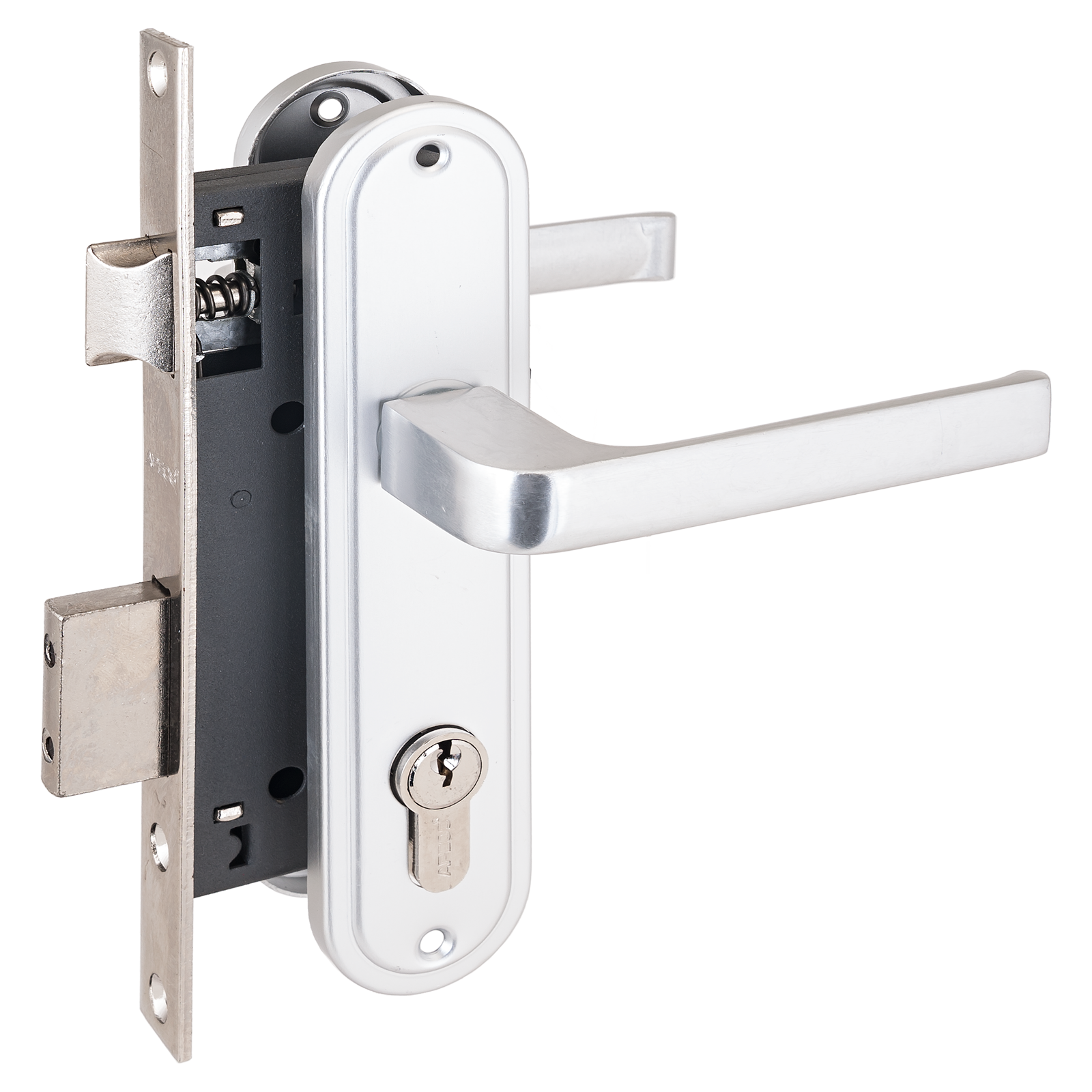 Прямоугольный ригель, вылет 20мм. Универсальная защелка. Стальной корпус с подшипником, покрыт полимерной краской. Межосевое расстояние 70мм. Удаление ключевого отверстия 40мм. Материал ручек алюминий. Гальваническое покрытие.