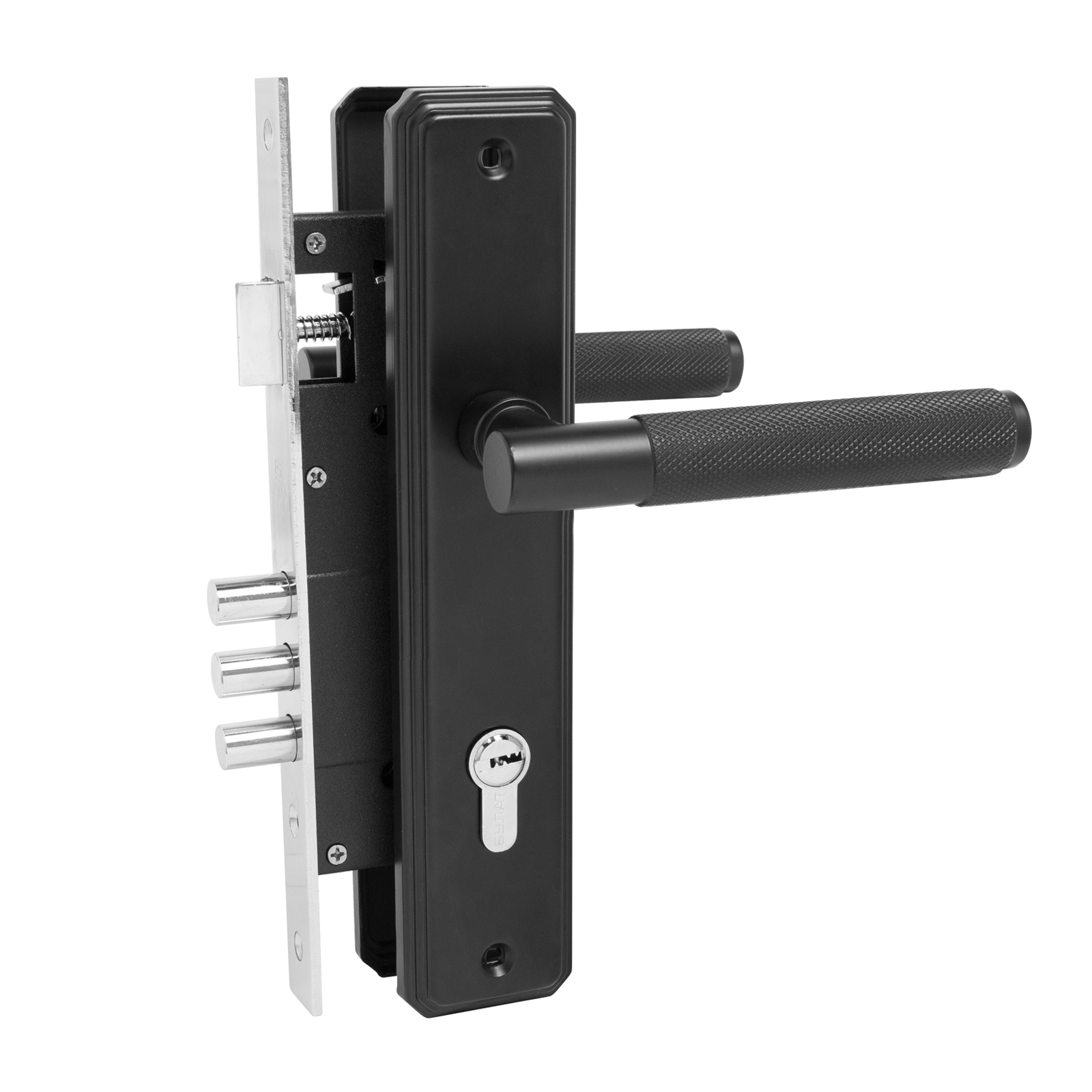 Универсальная защелка. Стальной корпус с подшипником, покрыт полимерной краской. Межосевое расстояние 85 мм. Удаление ключевого отверстия 45 мм. Материал ручек — стальной пруток, планки – сталь.