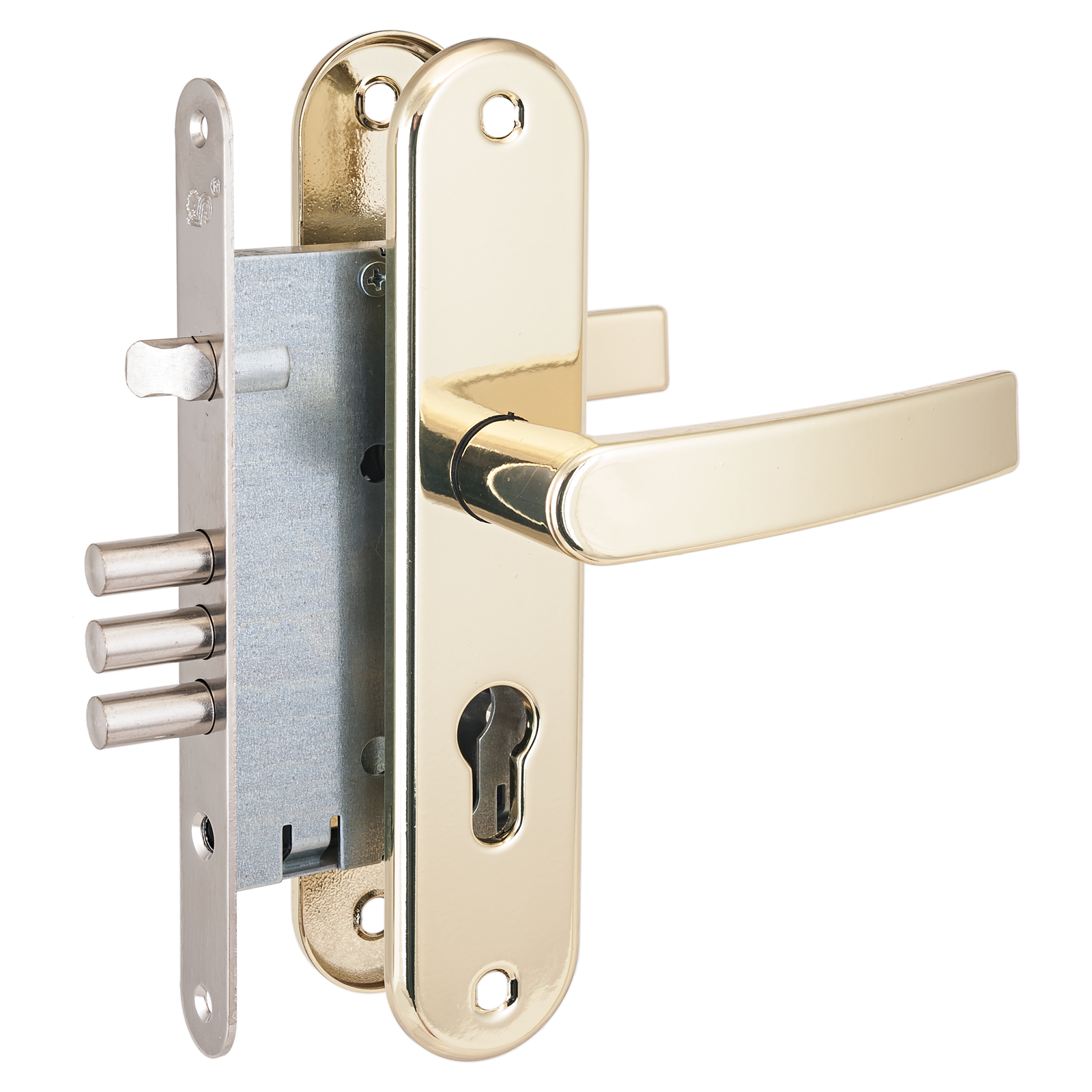 Три цилиндрических ригеля, вылет 22мм. Стальной оцинкованный корпус. Межосевое расстояние 55мм. Удаление ключевого отверстия 55мм.