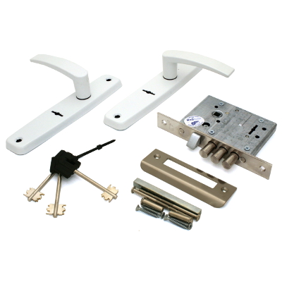Замок врезной с ручками, 8-и сувальдный. Предназначен для установки в деревянные двери толщиной 40-50мм, правого и левого открывания. Дверь может быть закрыта на защелку и открыта с помощью фалевой ручки при открытом засове замка.