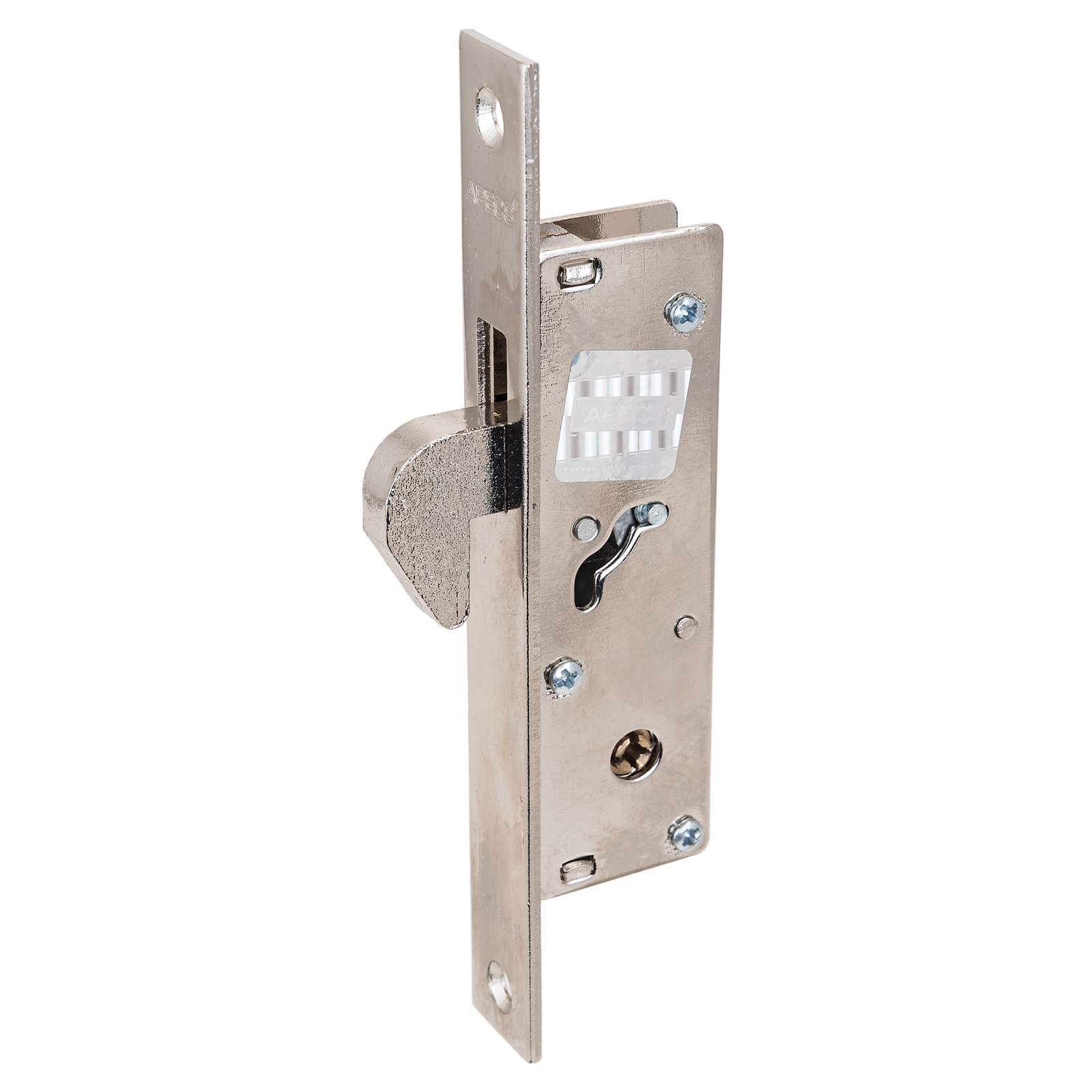 Узкопрофильный врезной замок с ригелем-крюклм. Может устанавливаться в раздвижные двери. Механизм секрета цилиндровый, под крестообразный ключ. Удаление ключевого отверстия: 20мм. Вылет ригелей: 18мм. Цвет торцевой планки — хром. 5 ключей.