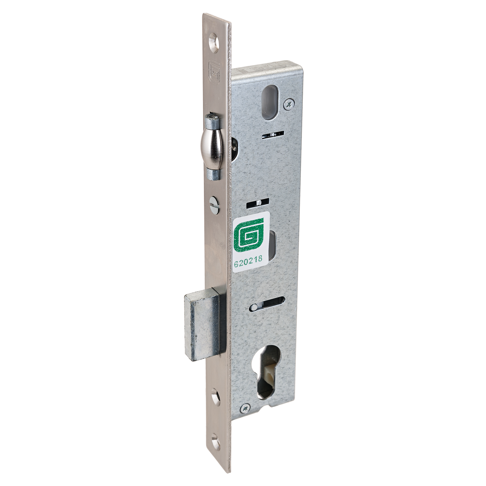 Замок врезной с роликовой защелкой, под цилиндровый механизм секрета, один прямой ригель, вылет ригеля 15мм. Предназначен для установки в алюминиевые, пластиковые и деревянные двери. Расстояние от торцевой планки до центра отверстия под цилиндр 25мм, ширина торцевой планки 24мм.