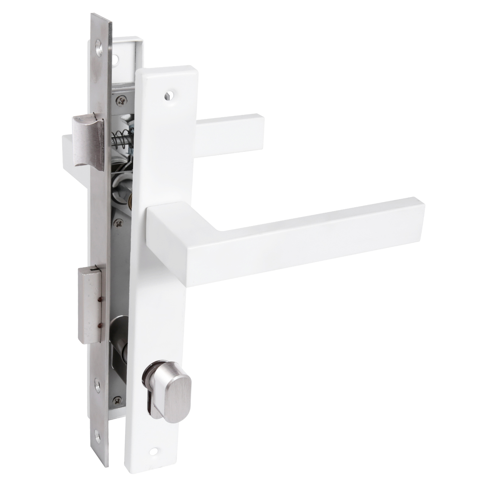 Замок врезной с ручками. Предназначен для установки в калиточные двери, правого и левого открывания. Возможна установка в деревянные двери, а так же двери из алюминиевого профиля. Дверь может быть закрыта на защелку и открыта с помощью фалевой ручки при открытом засове замка.