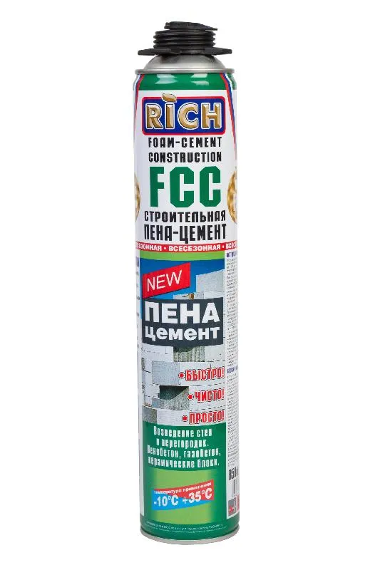 Пена — цемент строительная FCC RICH применяется при соединении различных материалом, заполнении пустот, проведении монтажных работ , установке дверных и оконных проемов.