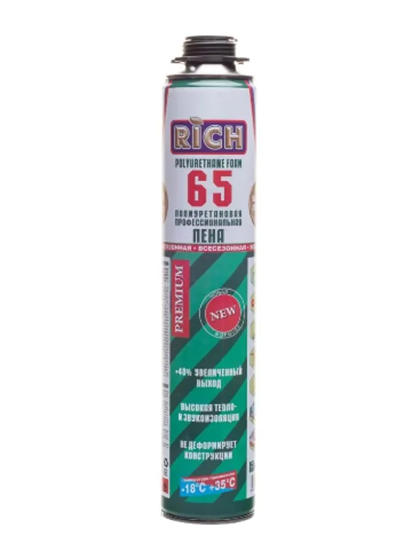 Пена монтажная серии RICH 65 PRO NEW FORMULA используется в процессе проведения строительно – ремонтных работ для заполнения пустот, а также в процессе монтажа различных коммуникаций, оконных и дверных конструкций.